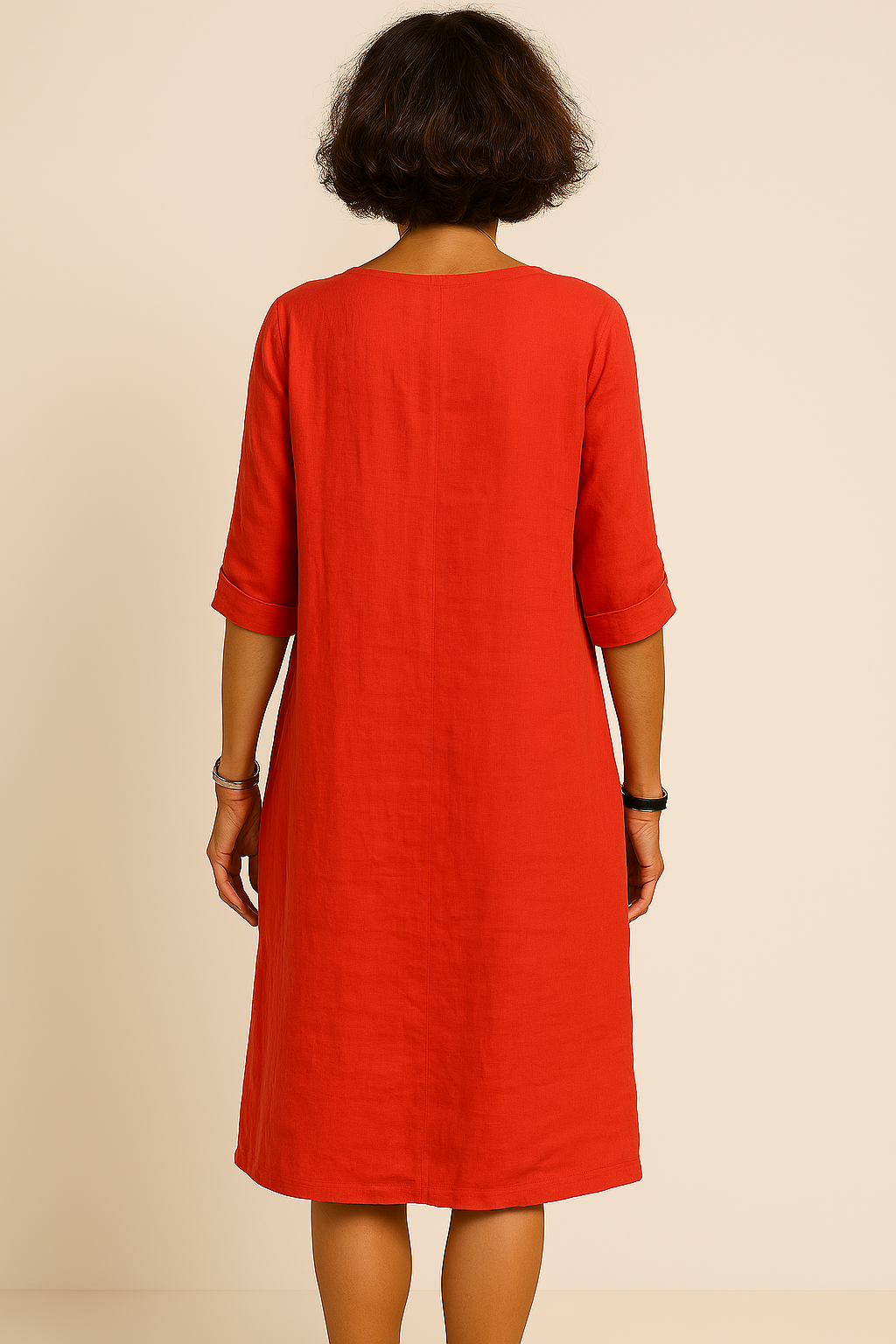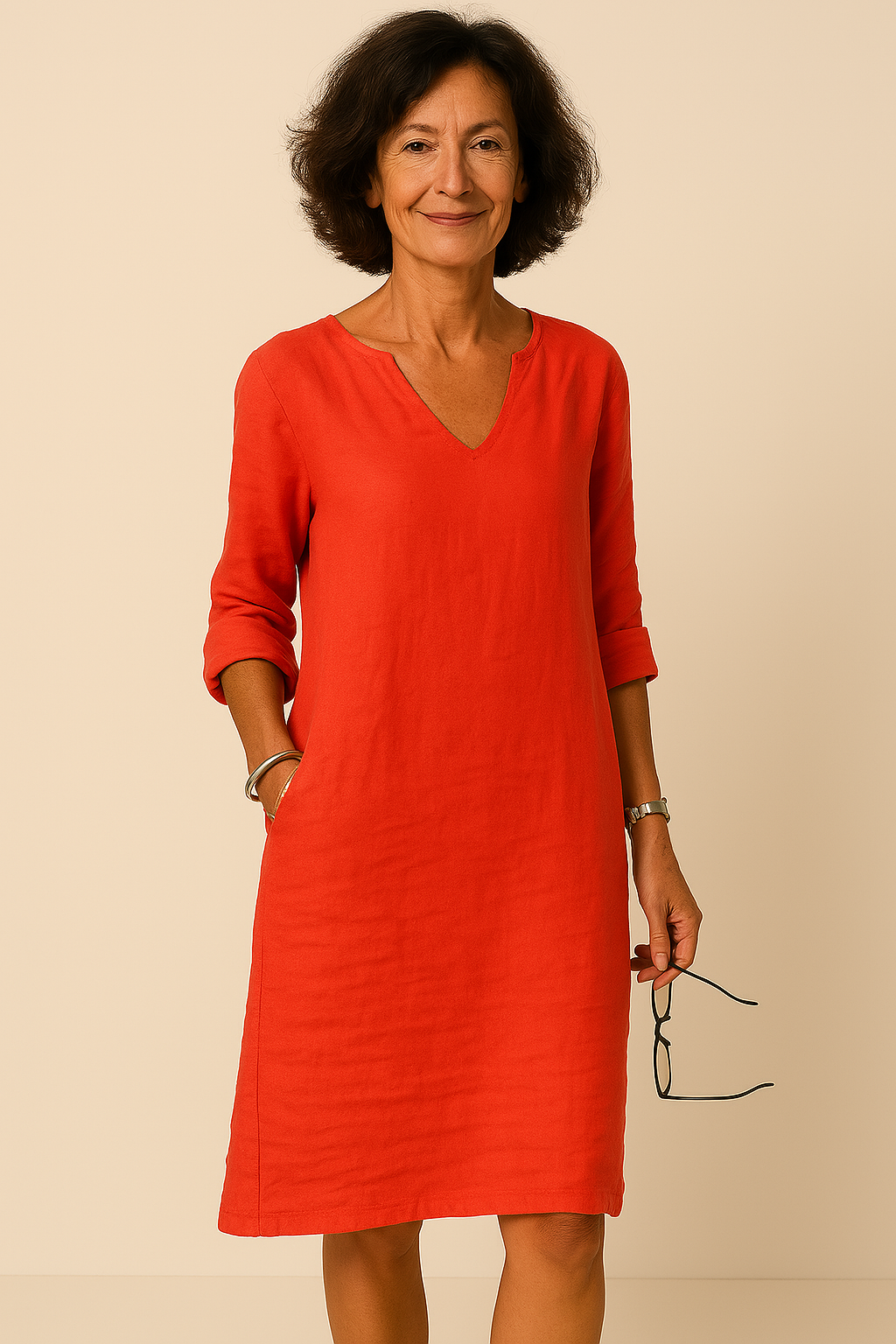 Inga™ hørkjole forener skandinavisk minimalisme med ubesværet komfort. Det luftige hør-blandingsmateriale giver en afslappet pasform og holder dig kølig på varme sommerdage. Med sin enkle V-udskæring og løstsiddende design er Inga™ kjolen det ideelle valg til både hverdagsbrug og feriestunder.