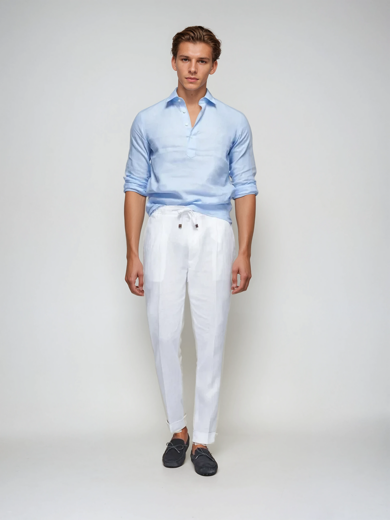 Linned Pop-over Skjorte – Lysblå kombinerer raffineret elegance med ultimativ bærekomfort. Det luftige linnedstof sikrer en naturlig åndbarhed, mens det subtile pop-over design tilføjer et stilfuldt, moderne præg. Perfekt til mænd, der ønsker et afslappet chic udseende uden at gå på kompromis med komforten.